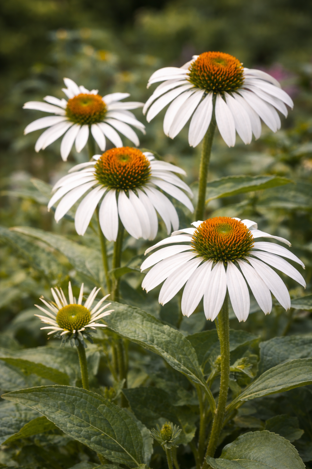 Jeżówka (Echinacea purpurea) biała to wyjątkowa bylina ogrodowa, która łączy w sobie elegancję, długie kwitnienie i dużą odporność na warunki uprawy. Tworzy efektowne, wyprostowane kępy obsypane dużymi, białymi kwiatami z charakterystycznym, wypukłym środkiem w odcieniu pomarańczowo-brązowym.