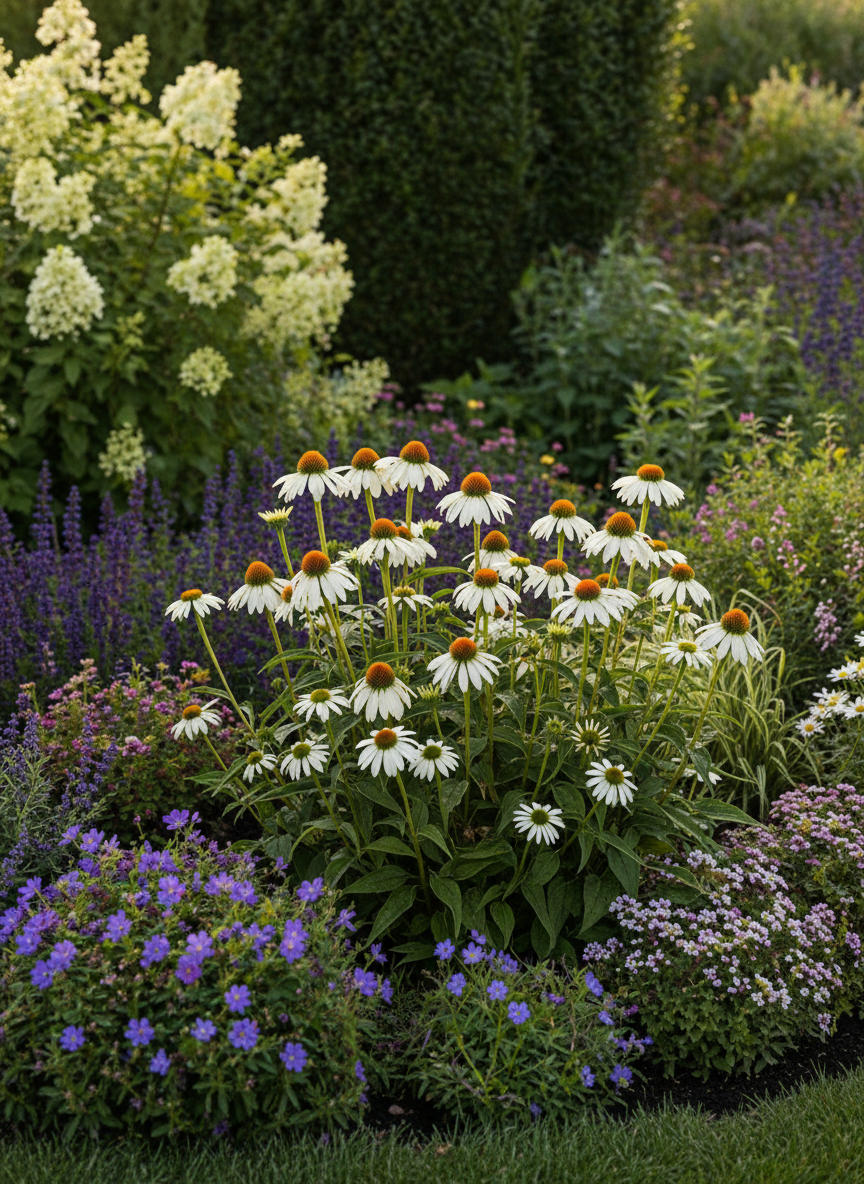 Jeżówka to również roślina miododajna – jej kwiaty przyciągają pszczoły, motyle i inne zapylacze, wprowadzając do ogrodu życie i naturalny ruch. Świetnie sprawdza się w nasadzeniach naturalistycznych, gdzie liczy się lekkość i swobodny charakter kompozycji.