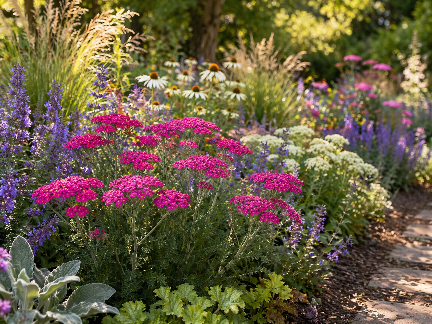 Krwawnik (Achillea millefolium) to kompaktowa, długo kwitnąca bylina ogrodowa, która tworzy zwarte kępy obsypane intensywnie różowymi, płaskimi kwiatostanami. To roślina, która daje mocny kolor na rabacie przez całe lato, a przy przycinaniu może powtarzać kwitnienie nawet do jesieni.