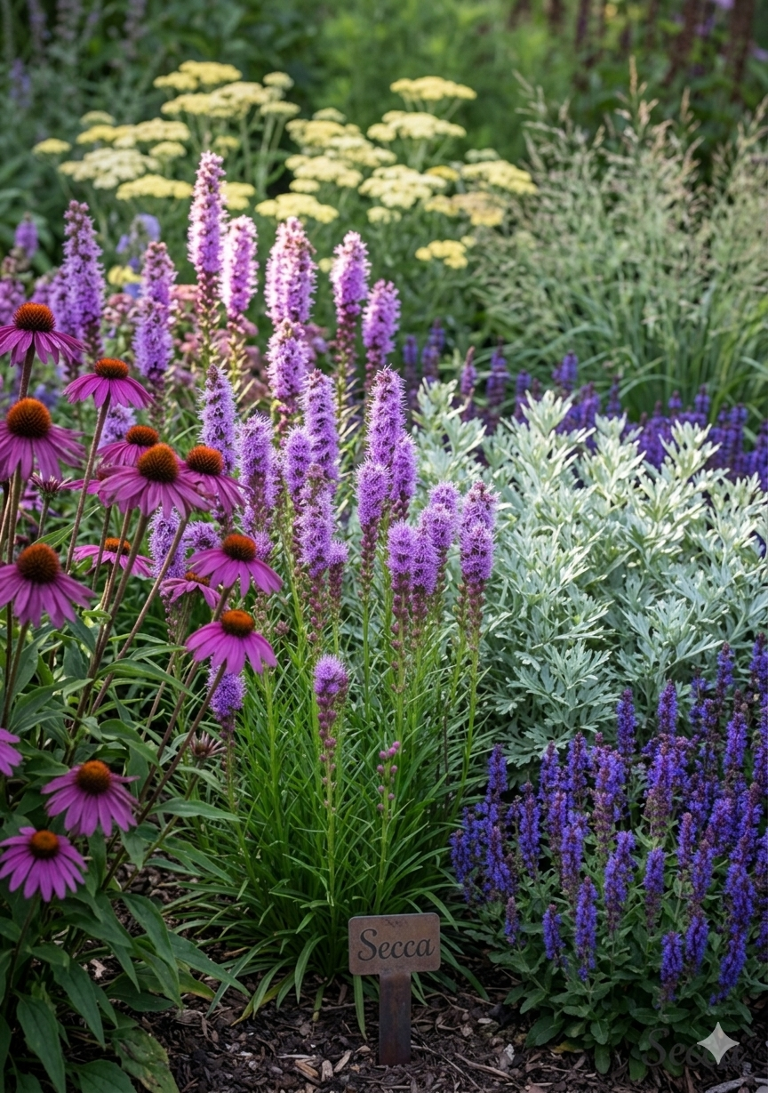 Liatra kłosowa (Liatris spicata) to wyjątkowa bylina, która wnosi na rabaty wyraźny pion i charakter. Jej największym wyróżnikiem są strzeliste, kłosowe kwiatostany w intensywnym, fioletowym kolorze, które rozwijają się nietypowo – od góry do dołu. Dzięki temu roślina przyciąga wzrok i wprowadza ciekawą dynamikę do nasadzeń.