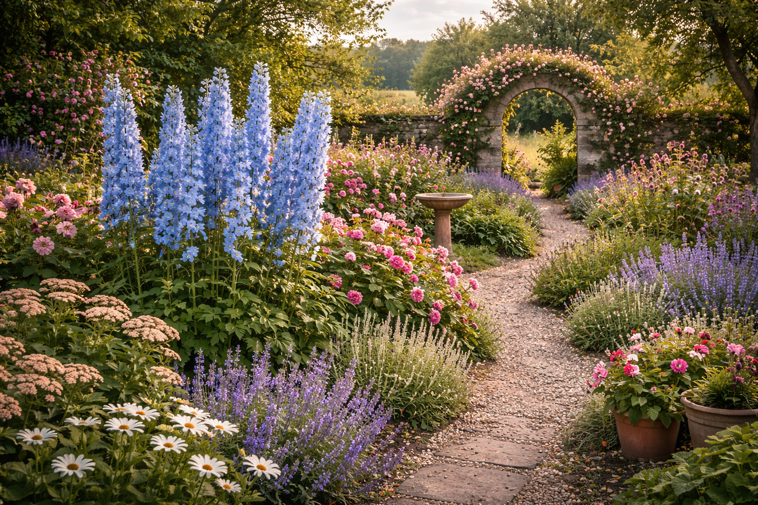 Ostróżka ogrodowa (Delphinium) z grupy ‘Pacific’ to efektowna, wysoka bylina ogrodowa, która tworzy okazałe, pionowe kwiatostany w intensywnie niebieskim kolorze. To roślina, która przyciąga wzrok i buduje strukturę rabaty – idealna jako mocny akcent w ogrodzie.