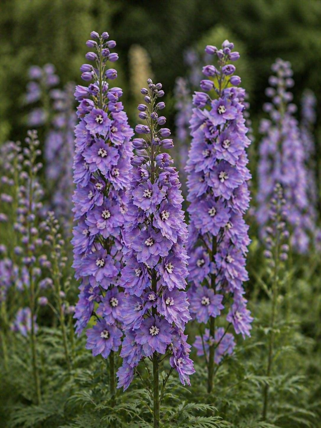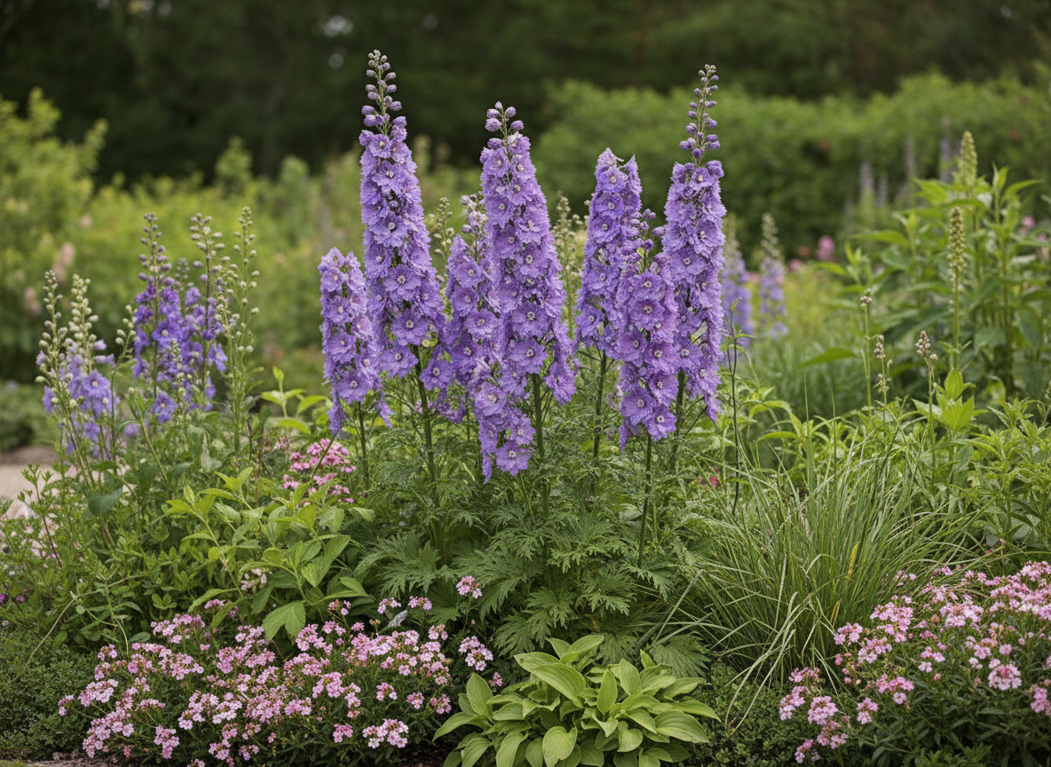 Ostróżka ogrodowa (Delphinium) z grupy ‘Pacific’ to efektowna, wysoka bylina ogrodowa, która tworzy okazałe, pionowe kwiatostany w jasnofioletowym kolorze. To roślina, która przyciąga wzrok i buduje strukturę rabaty – idealna jako mocny akcent w ogrodzie.