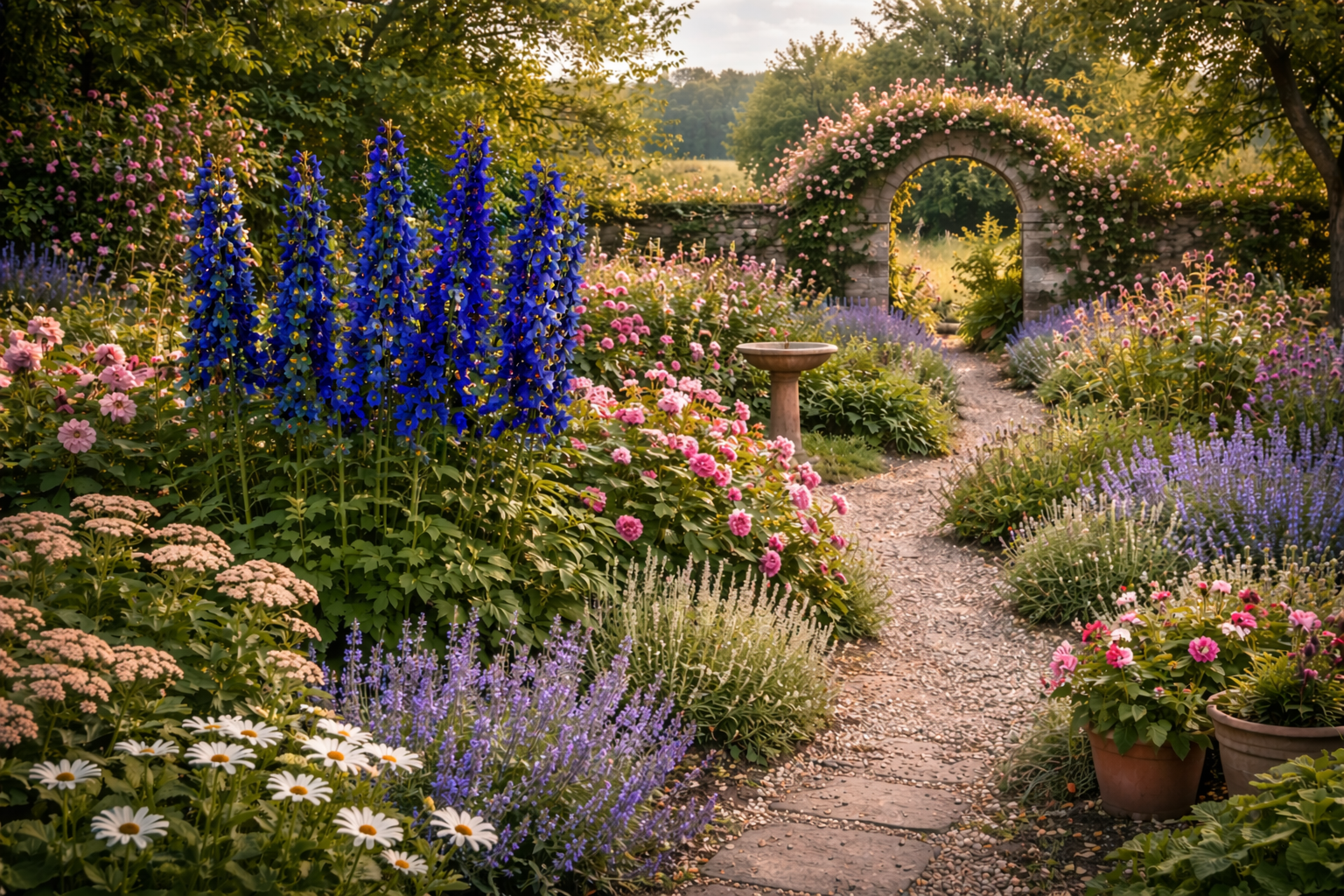 Ostróżka ogrodowa (Delphinium) z grupy ‘Pacific’ to efektowna, wysoka bylina ogrodowa, która tworzy okazałe, pionowe kwiatostany w intensywnie niebieskim kolorze. To roślina, która przyciąga wzrok i buduje strukturę rabaty – idealna jako mocny akcent w ogrodzie.