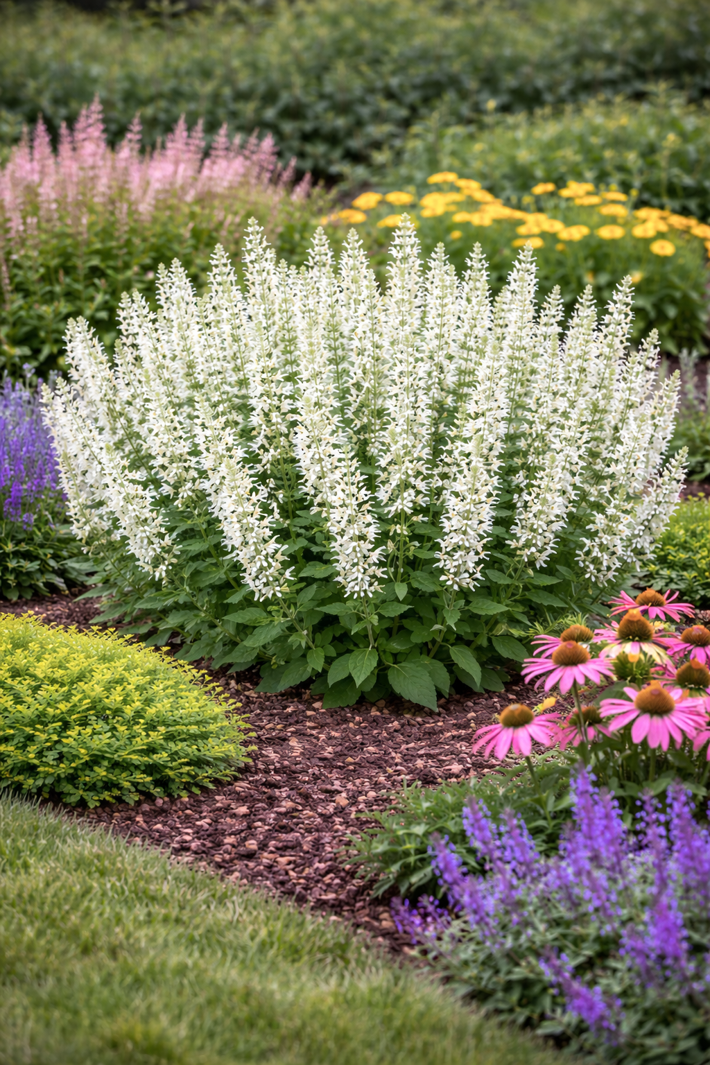 Szałwia omszona (Salvia nemorosa) to długo kwitnąca bylina ogrodowa, która tworzy zwarte, dekoracyjne kępy obsypane białymi kwiatami. To roślina, która daje kolor w ogrodzie przez wiele tygodni – od późnej wiosny aż do końca lata, a przy przycinaniu potrafi powtarzać kwitnienie.