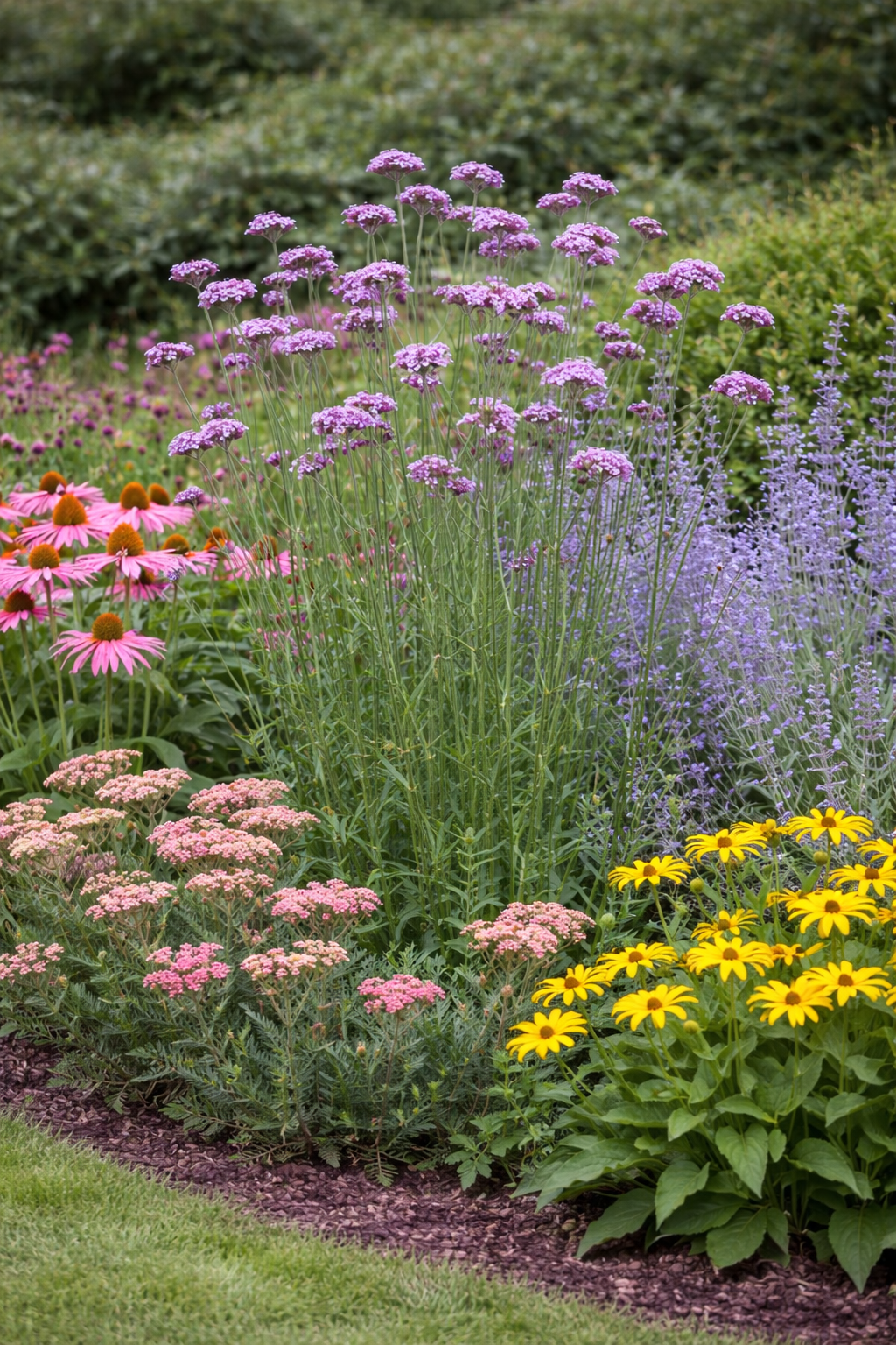 Werbena patagońska to jedna z tych roślin, które robią efekt „wow”, mimo że z pozoru są lekkie i delikatne. Tworzy wysokie, ażurowe kępy z cienkich, sztywnych pędów, które dorastają nawet do 120–150 cm wysokości. Dzięki temu nie przytłacza rabaty, tylko dodaje jej przestrzeni i lekkości.
