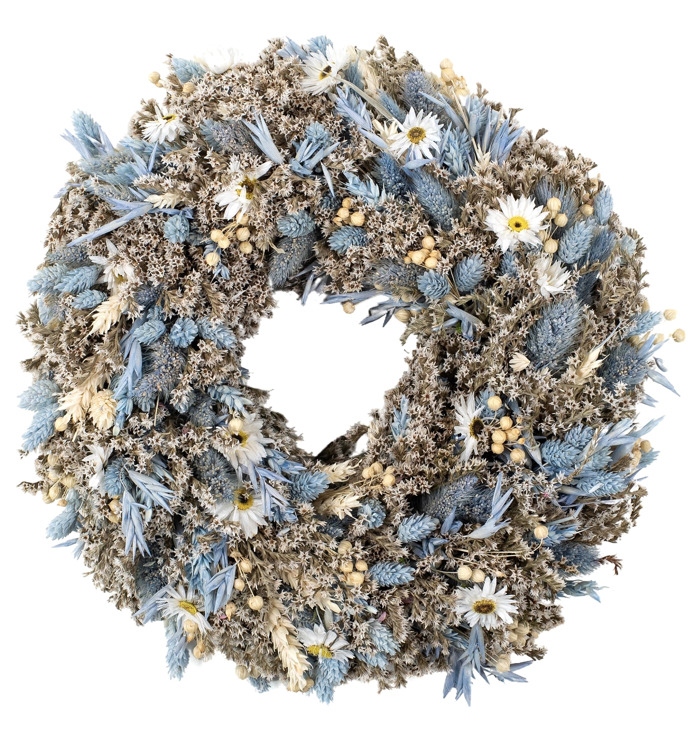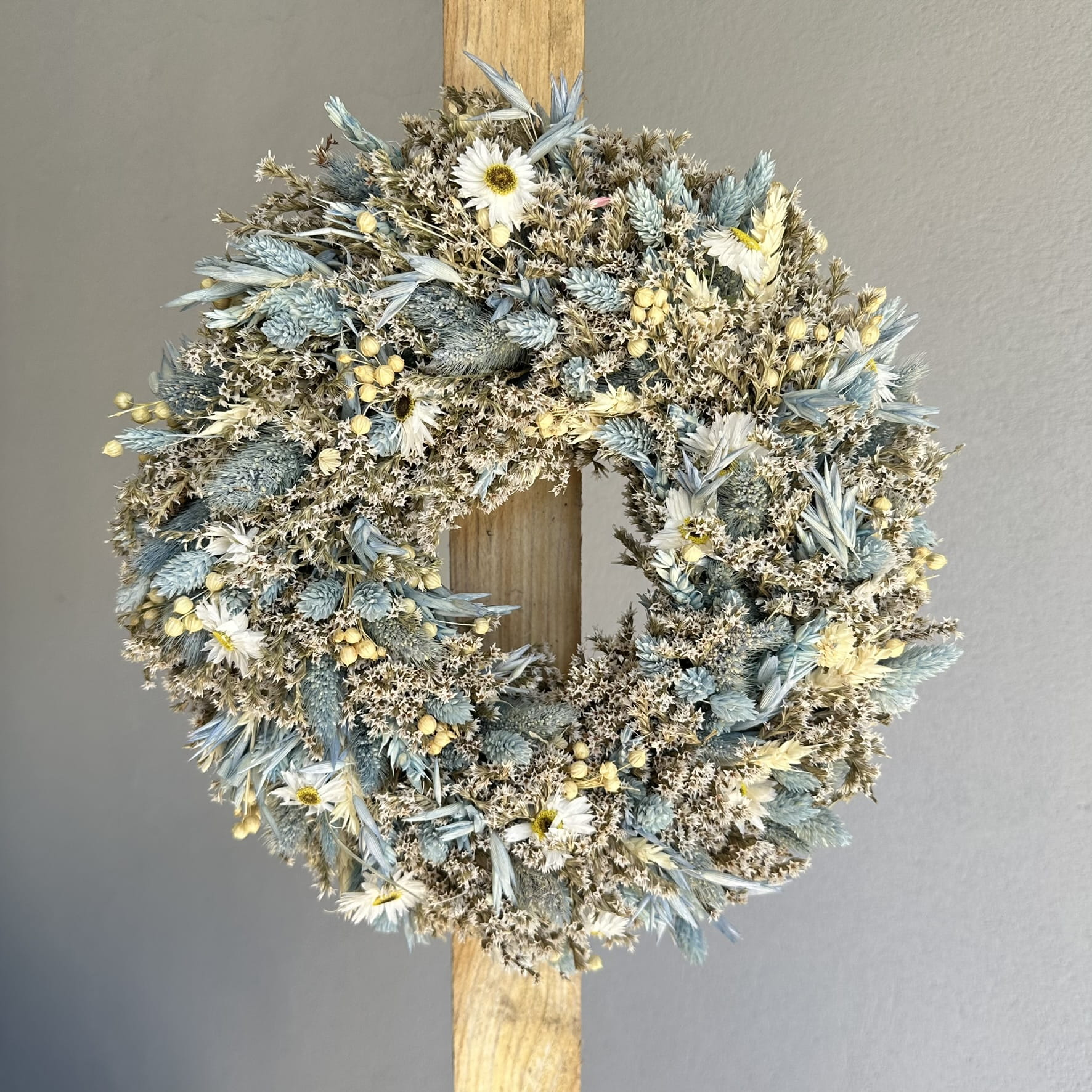 Błękitny wianek z suszonych kwiatów 30 cm, wianek na drzwi