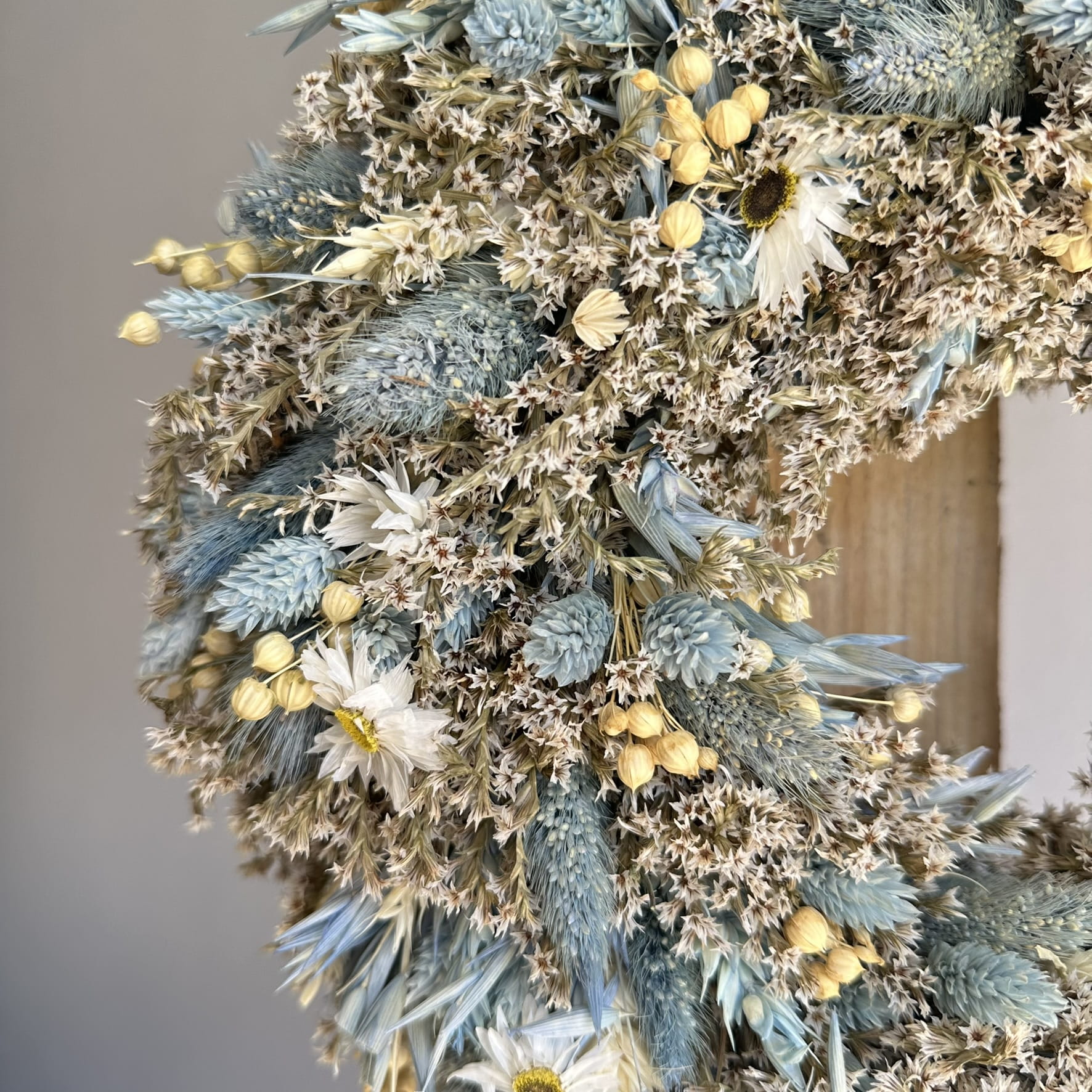 Wianek z suszonych kwiatów w odcieniach błękitu, kremu i bieli. Subtelny, spokojny i bardzo elegancki. Wykonany w Polsce z naturalnych, suszonych roślin. Doskonale uzupełnia wnętrza, dodając im charakteru i naturalnego uroku – świetnie prezentuje się zarówno jako dekoracja stołu, jak i zawieszka na drzwiach (z tyłu posiada uchwyt do zawieszenia).